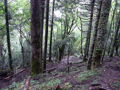 回去的路走到一半就开始下雨,我们穿上雨衣在大路小路间匆忙钻行,大刚还不慎拉伤了膝盖韧带。快到目的地的时候我们迷了路,在走岔了两次之后依靠手杖上的指南针大概辨明方向才走了出来。全程整九小时。